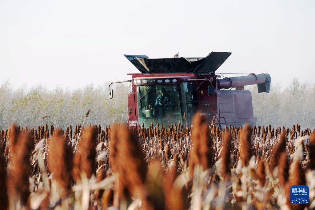 10月11日,在位于黑龍江省肇東市的北大荒集團四方山農場有限公司,機械設備在進行高粱收獲作業。