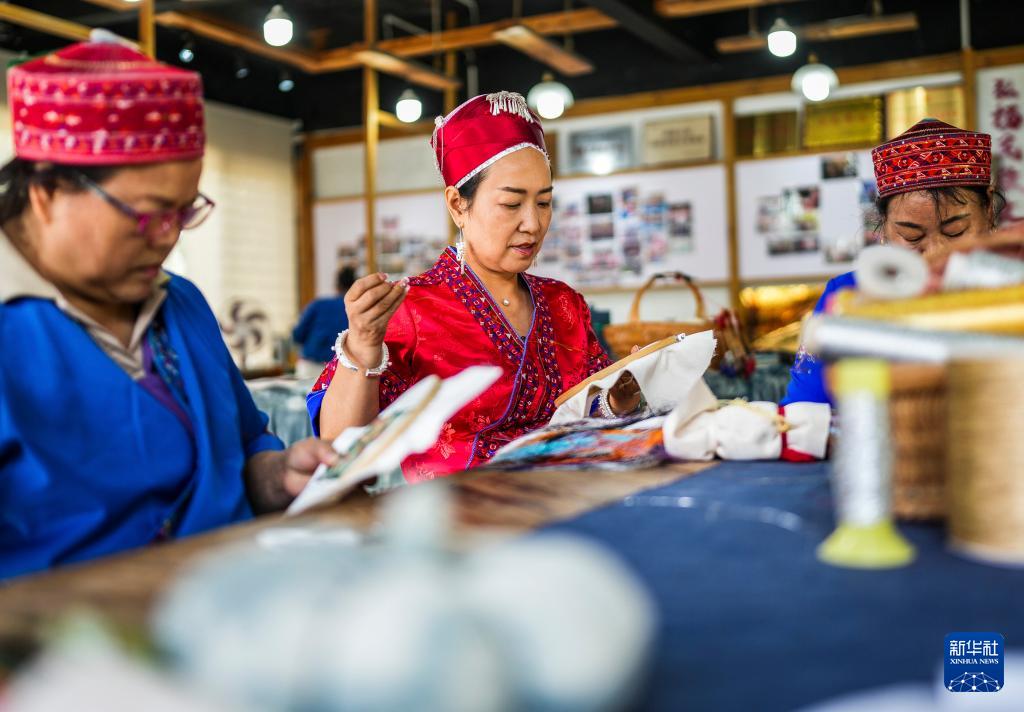 龍祿穎(中)在位于貴州省施秉縣的舞水云臺非遺工坊進行刺繡創作(10月10日攝)。