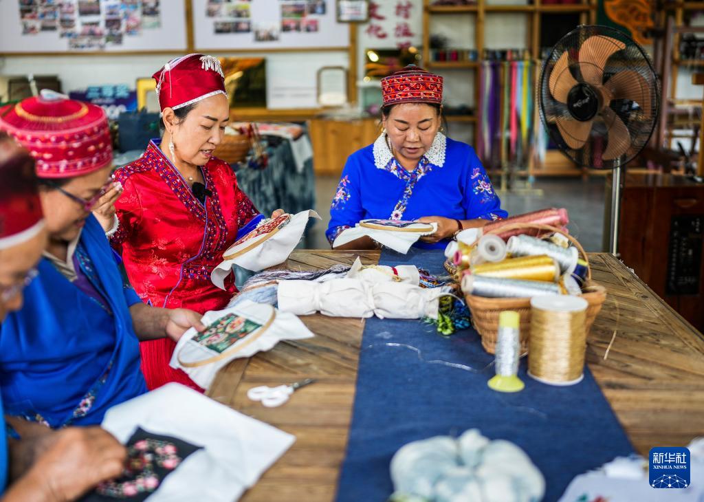 龍祿穎(左三)在位于貴州省施秉縣的舞水云臺非遺工坊進行刺繡創作(10月10日攝)。