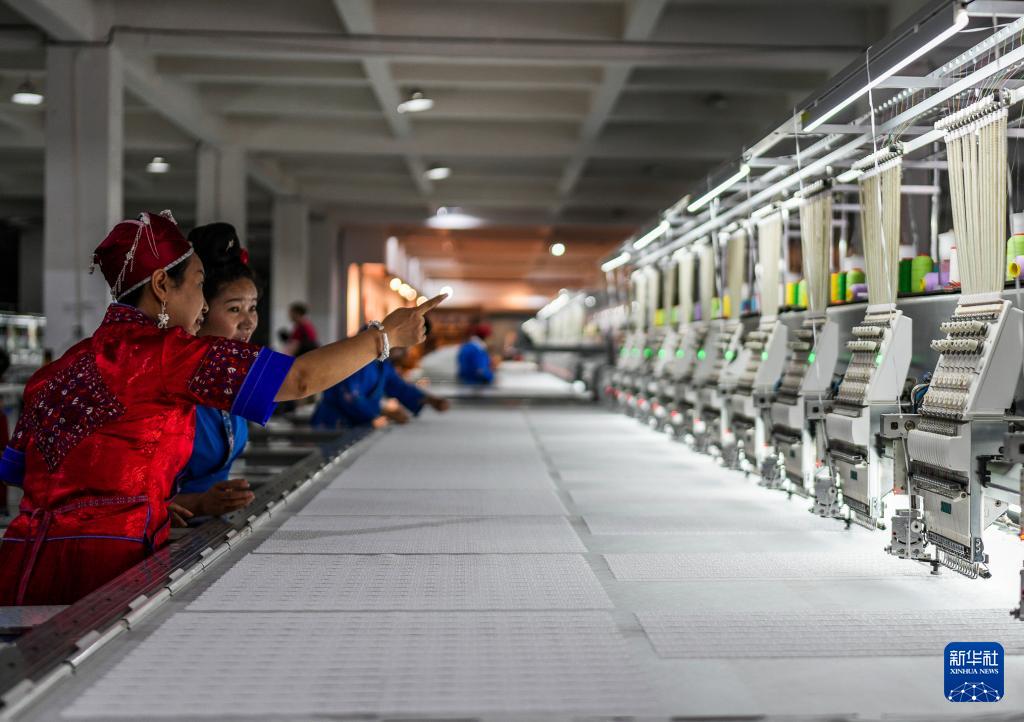 龍祿穎在位于貴州省施秉縣的舞水云臺智能繡花車間指導(dǎo)工人操作設(shè)備(10月10日攝)。