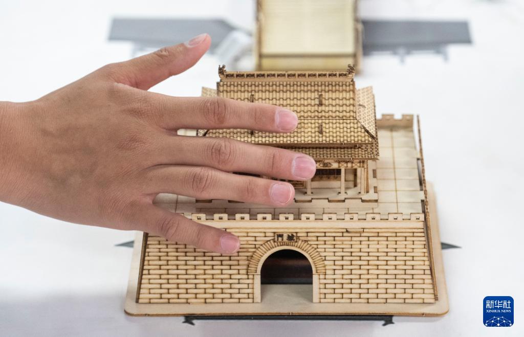 10月13日,視障人士在發布會后,觸摸北京中軸線建筑模型。