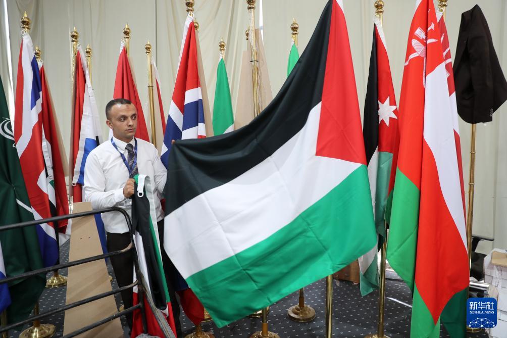 10月13日,在埃及沙姆沙伊赫,一名工作人員在沙姆沙伊赫峰會的媒體中心整理巴勒斯坦國旗。