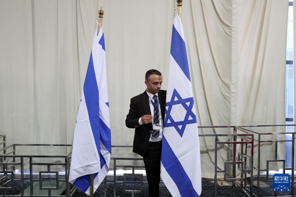 10月13日,在埃及沙姆沙伊赫,一名工作人員在沙姆沙伊赫峰會的媒體中心整理以色列國旗。