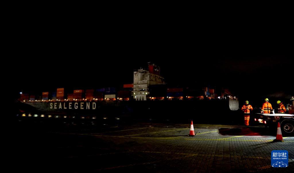 10月13日,在英國費(fèi)利克斯托港,中歐北極快航航線首艘貨船駛?cè)氪a頭。新華社記者 李穎 攝