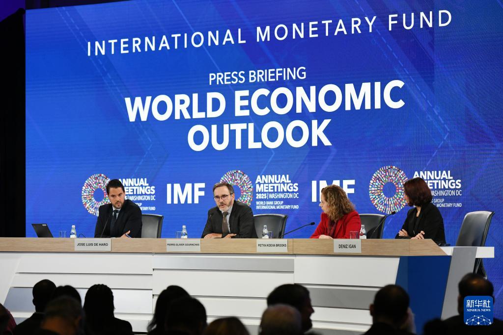 10月14日,在美國華盛頓,國際貨幣基金組織首席經濟學家皮埃爾-奧利維耶·古蘭沙(左二)在《世界經濟展望報告》新聞發布會上講話。新華社記者 李睿 攝