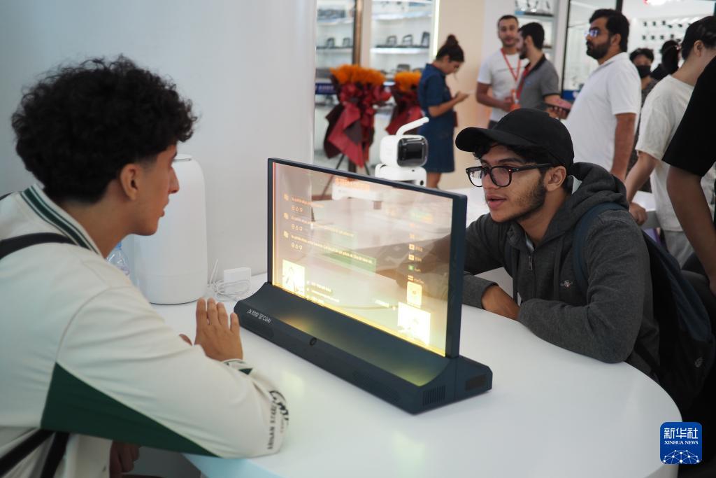 10月14日,兩名外籍客商在義烏全球數(shù)貿(mào)中心體驗(yàn)AI翻譯互動(dòng)屏。