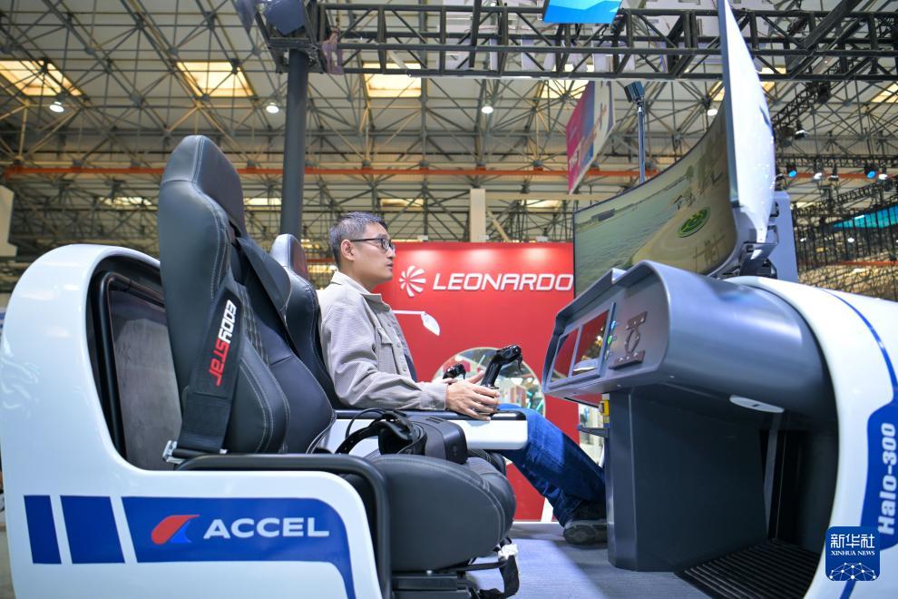 10月14日,工作人員在天津直博會直升機館內(nèi)調(diào)試模擬飛行體驗設(shè)備。