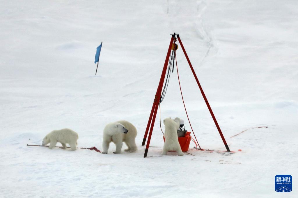 8月30日,北極熊媽媽和兩只熊寶寶在考察隊尚未完成布放的冰基浮標處活動。