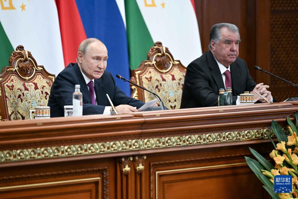 10月9日,在塔吉克斯坦首都杜尚別,俄羅斯總統普京(左)和塔吉克斯坦總統拉赫蒙共同出席聯合記者會。