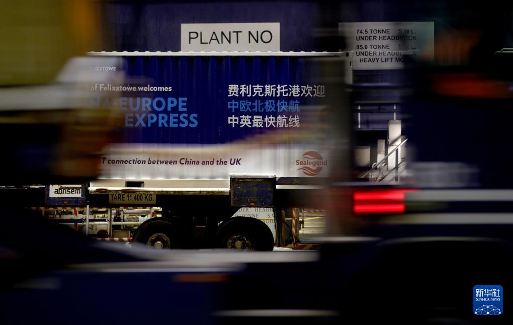 這是10月13日在英國費(fèi)利克斯托港拍攝的印有“費(fèi)利克斯托港歡迎中歐北極快航”字樣的集裝箱。