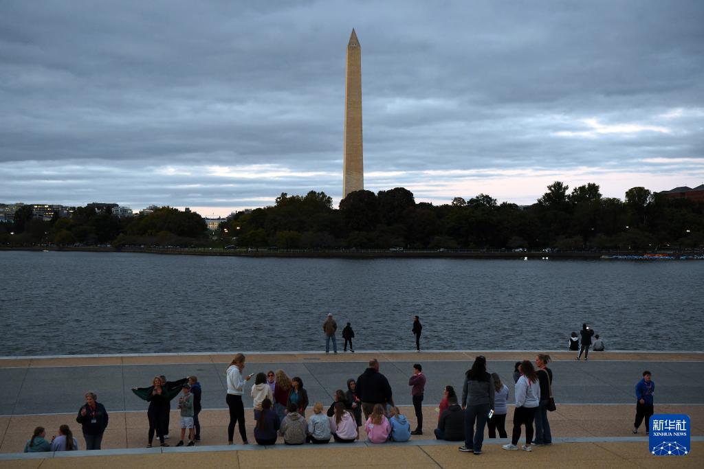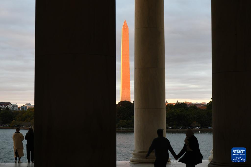 這是10月14日在美國(guó)華盛頓杰斐遜紀(jì)念堂拍攝的日落時(shí)分的華盛頓紀(jì)念碑。