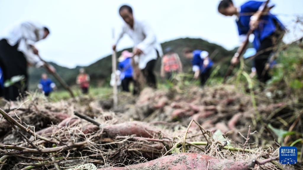 10月15日,廣西三江侗族自治縣林溪鎮高秀村村民在田間收獲紅薯。