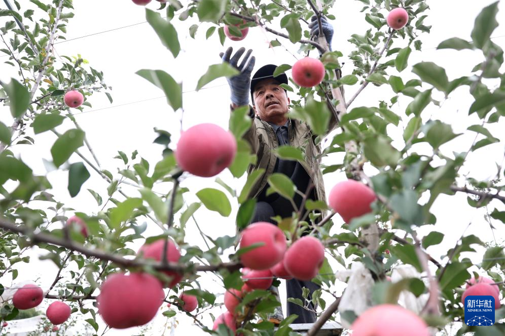 果農在甘肅省隴南市禮縣永興鎮何家村一處蘋果種植基地內采摘蘋果(10月14日攝)。