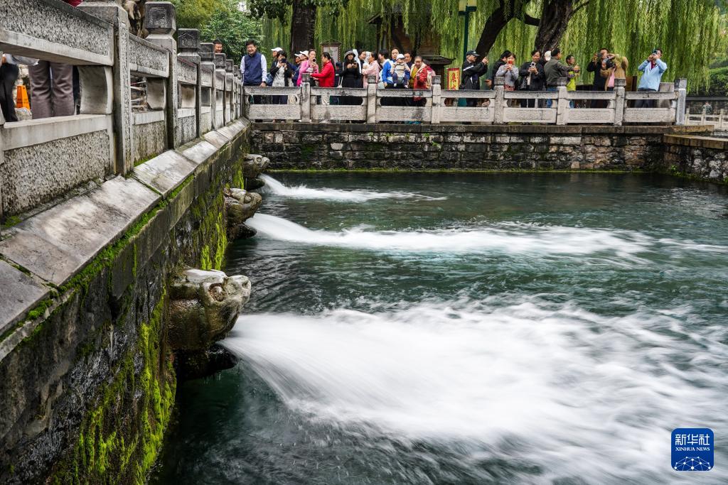 10月15日,游客在濟南趵突泉公園觀光游覽。趵突泉實時水位達到30.32米,刷新1966年以來的最高水位紀錄。