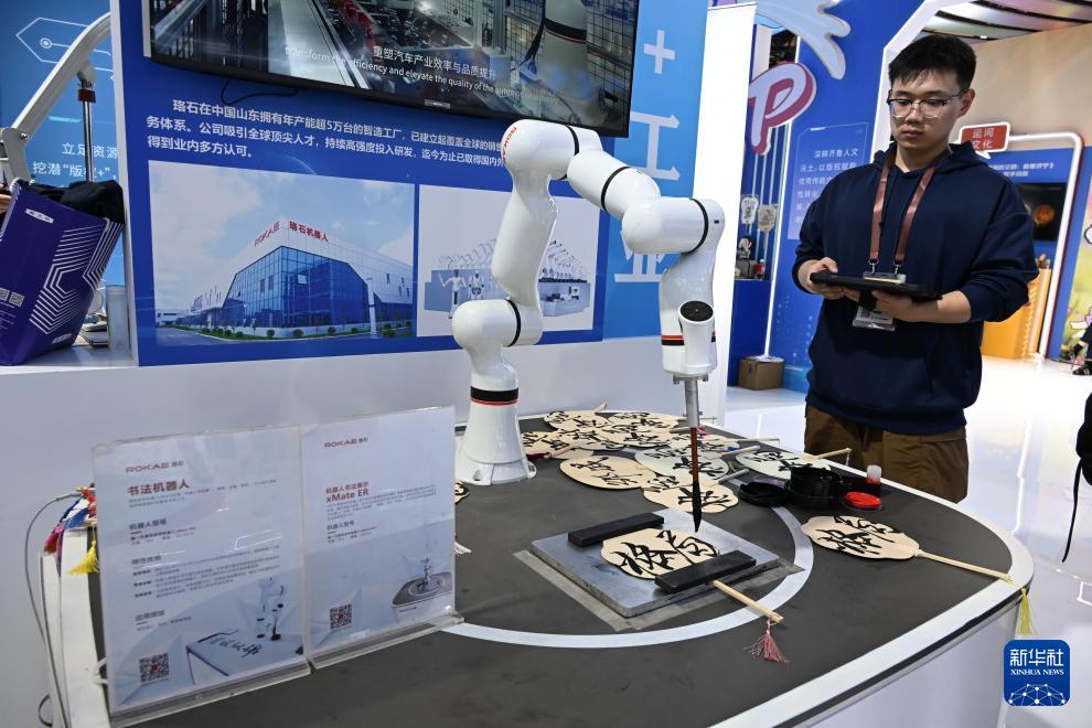 10月16日,與會(huì)人員在第十屆中國國際版權(quán)博覽會(huì)上操控書法機(jī)器人。