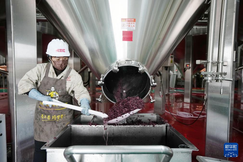 工作人員在銀川市永寧縣閩寧鎮的賀蘭紅酒莊對釀酒葡萄進行壓榨處理(10月14日攝)。