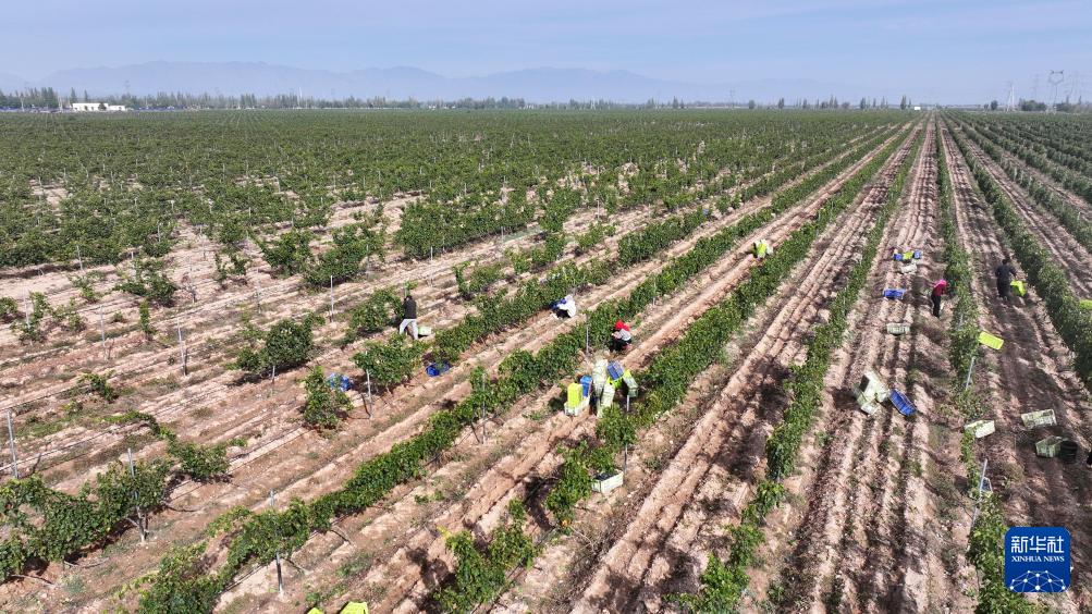 農戶在銀川市永寧縣閩寧鎮葡萄地里采摘釀酒葡萄(無人機照片,10月14日攝)。