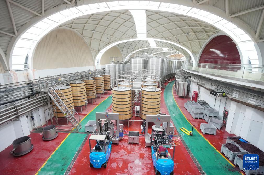 為了移民群眾“穩得住、能致富”,閩寧鎮因地制宜,大力發展葡萄酒產業,為這片不毛之地帶來了綠色的發展生機。閩寧鎮所在的寧夏賀蘭山東麓葡萄酒產區位于北緯38度左右,是業界公認適合種植釀酒葡萄和生產高端葡萄酒的“黃金地帶”之一。依托氣候、資源優勢,2021年,寧夏國家葡萄及葡萄酒產業開放發展綜合試驗區在閩寧鎮掛牌。截至2024年底,閩寧鎮釀酒葡萄種植面積達7.5萬畝,建成葡萄酒企業13家,年產葡萄酒2.6萬噸,綜合產值30億元,紫色葡萄串成為當地移民增收致富的“紫色夢想”。