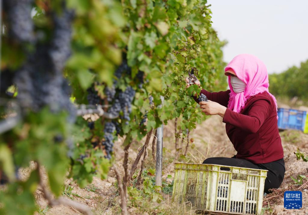 農戶在銀川市永寧縣閩寧鎮葡萄地里采摘釀酒葡萄(10月14日攝)。