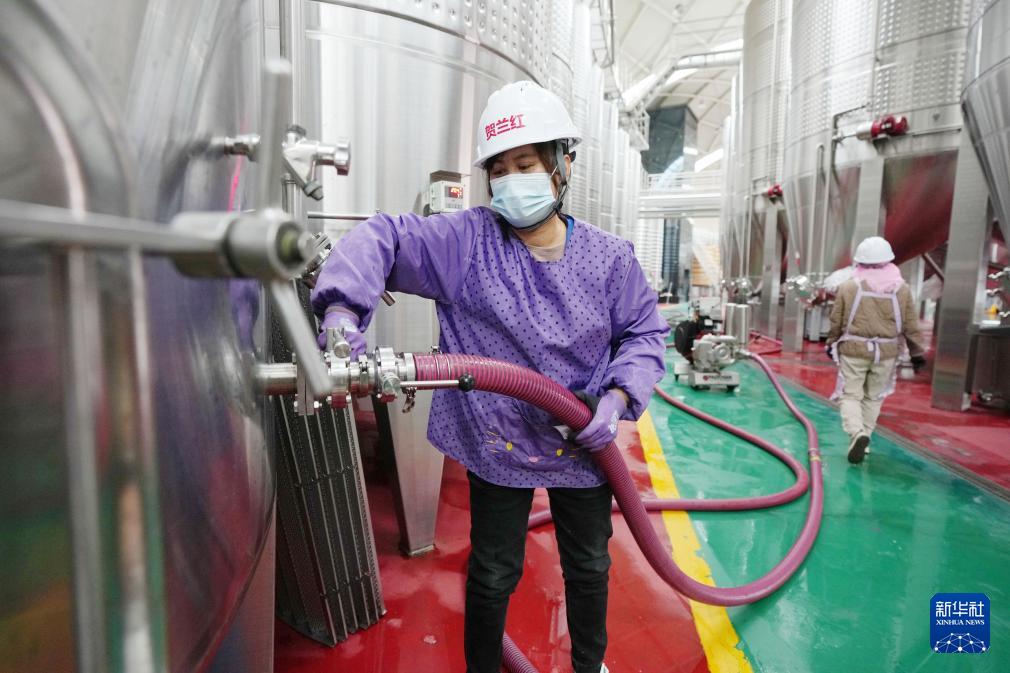 工作人員在銀川市永寧縣閩寧鎮的賀蘭紅酒莊輸送葡萄汁(10月14日攝)。