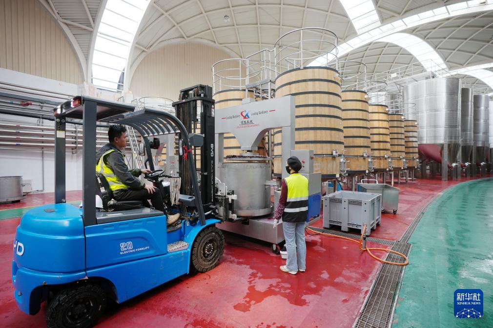 工作人員在銀川市永寧縣閩寧鎮賀蘭紅酒莊釀酒車間工作(10月14日攝)。