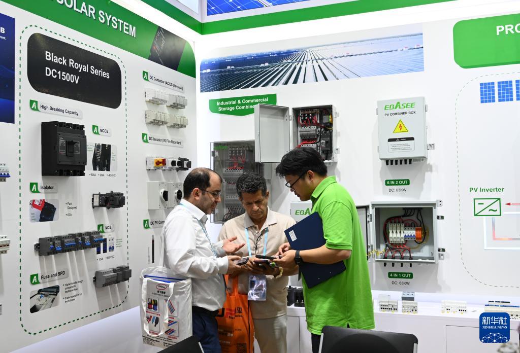 10月19日,客商與展商在第138屆廣交會展館日月元科技(深圳)有限公司展臺交談。