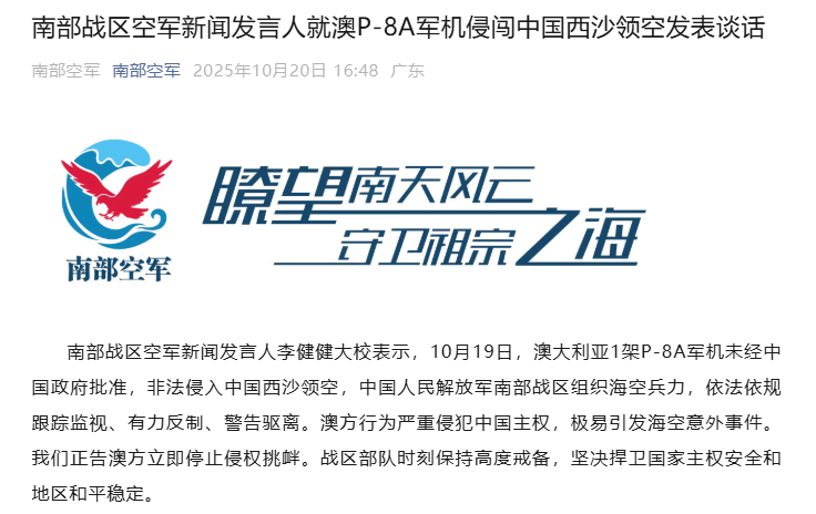 南部戰區空軍新聞發言人就澳P-8A軍機侵闖中國西沙領空發表談話