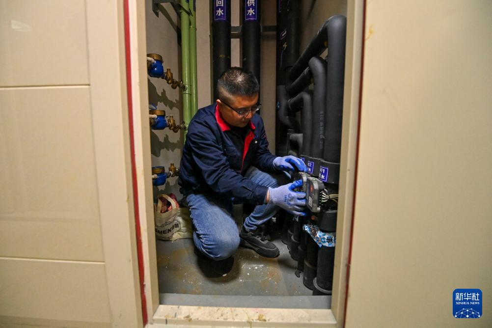 10月20日,在太原市萬柏林區一小區,工作人員在樓道供熱管井間內檢查分戶流量情況。