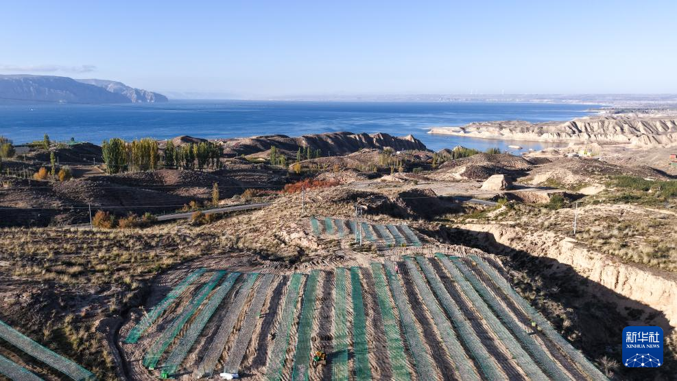 10月18日拍攝于青海省海南藏族自治州共和縣龍羊新村龍羊峽海湖漁業捕撈合作社的小銀魚晾曬網(無人機照片)。