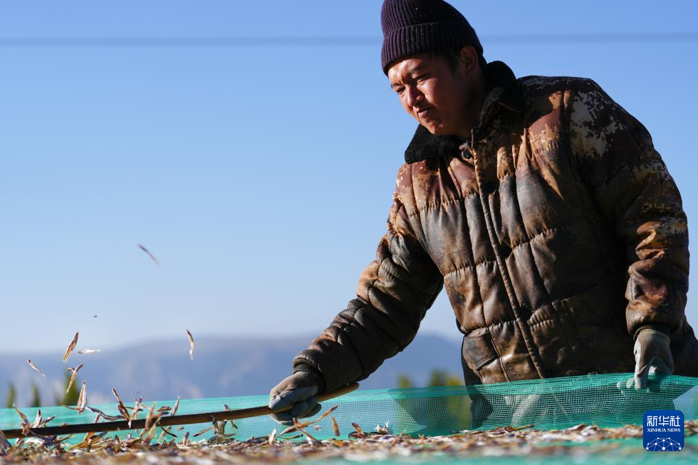 10月18日,在青海省海南藏族自治州共和縣龍羊新村龍羊峽海湖漁業捕撈合作社,一名工人將曬好的小銀魚抖散,以防在后續加工中出現粘連。