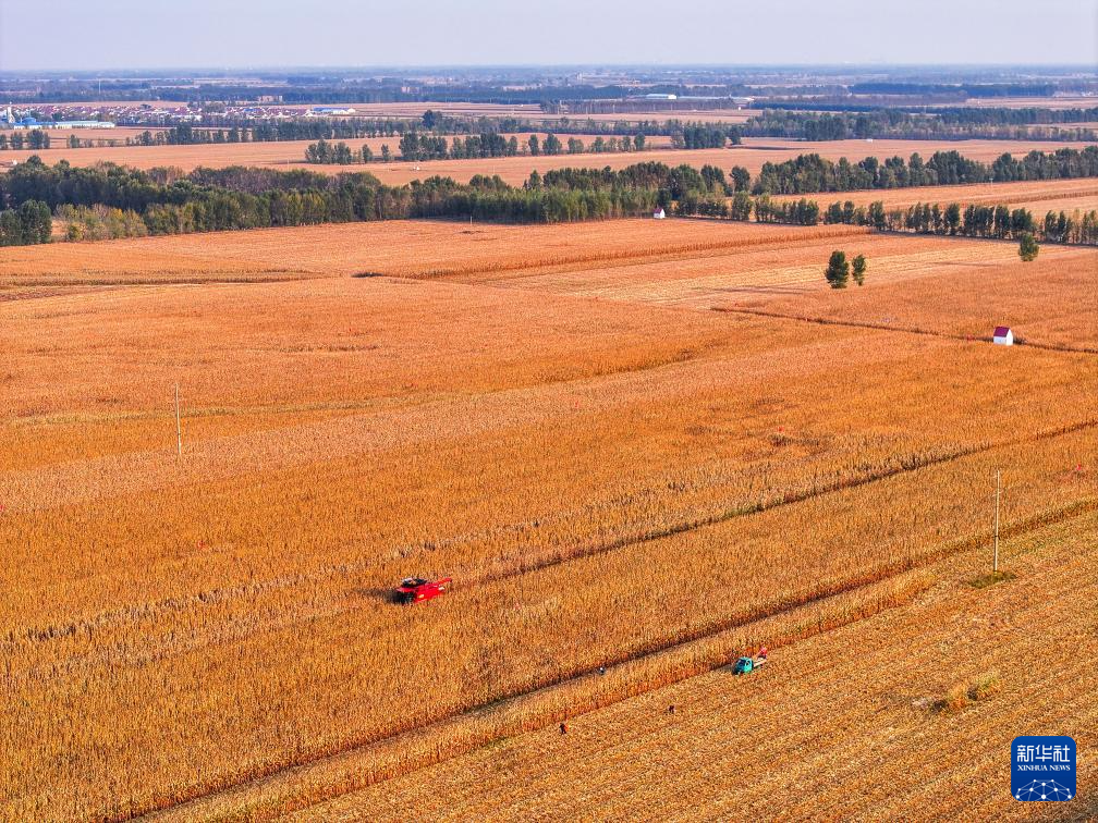 10月18日,在通遼市科爾沁左翼后旗吉爾嘎朗鎮(zhèn),農(nóng)機(jī)手駕駛收割機(jī)收割玉米(無人機(jī)照片)。