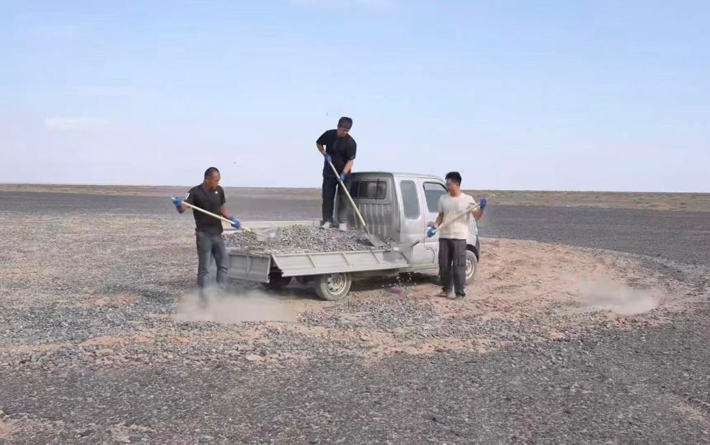 "看到車輪碾過標(biāo)語那一刻,就像碾在歷史的脊梁上。"網(wǎng)絡(luò)博主陸遙得知標(biāo)語被破壞后,主動(dòng)驅(qū)車兩千多公里,經(jīng)歷六天抵達(dá)哈密。他和朋友們拉運(yùn)20噸砂石,才終于修復(fù)這些"疤痕"。