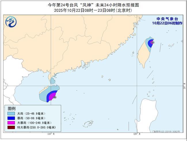 降水預報:22日08時至23日08時,海南島、臺灣島北部、廣東雷州半島等地有大到暴雨,其中海南島東南部、臺灣島北部等地部分地區有大暴雨,局地特大暴雨(250-260毫米)。