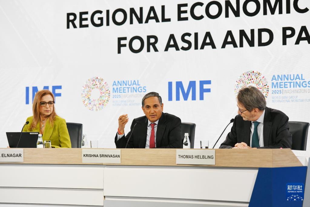 10月16日,在美國(guó)華盛頓,國(guó)際貨幣基金組織(IMF)亞太部主任斯里尼瓦桑(中)在新聞發(fā)布會(huì)上講話。