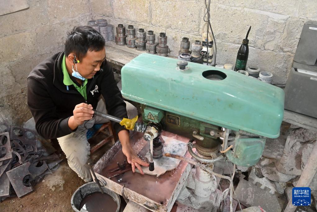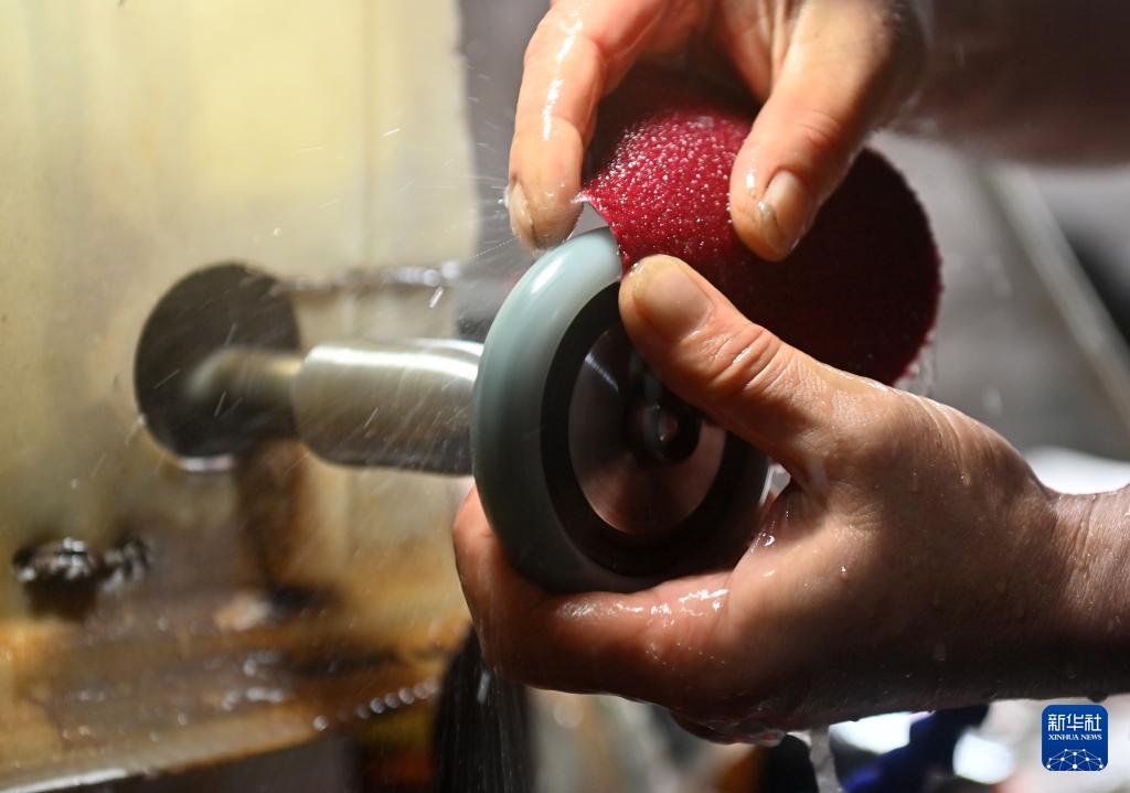 10月21日,在廣西龍勝各族自治縣三門鎮(zhèn)大地村,村民蒙駿寧在家庭作坊加工玉器。