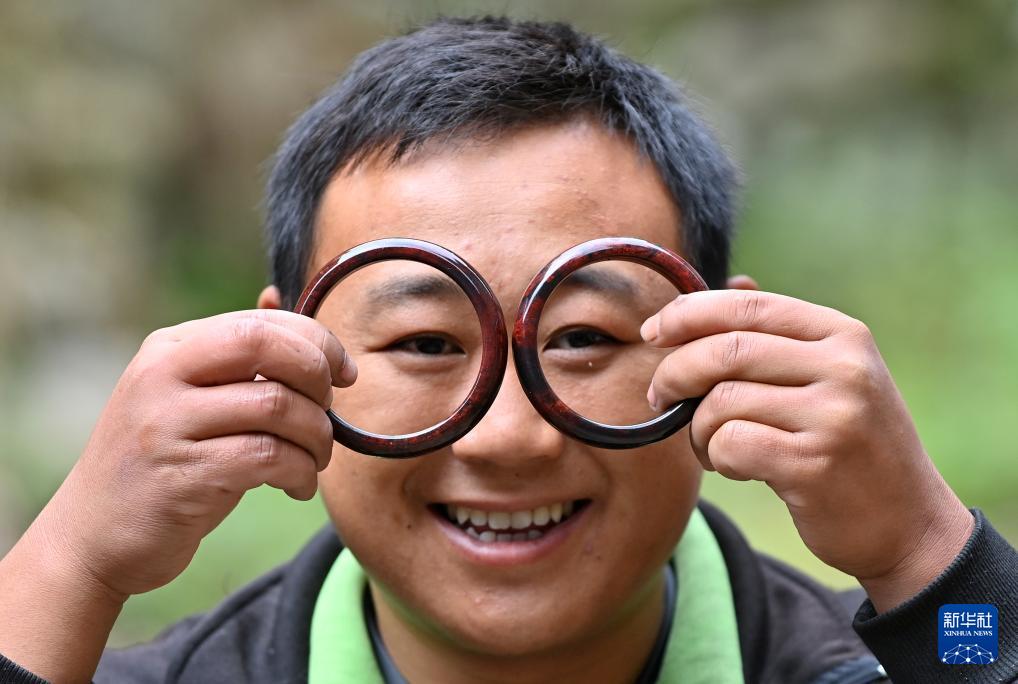 10月21日,在廣西龍勝各族自治縣三門鎮(zhèn)大地村,村民蒙駿寧展示自己加工的一對(duì)手鐲。