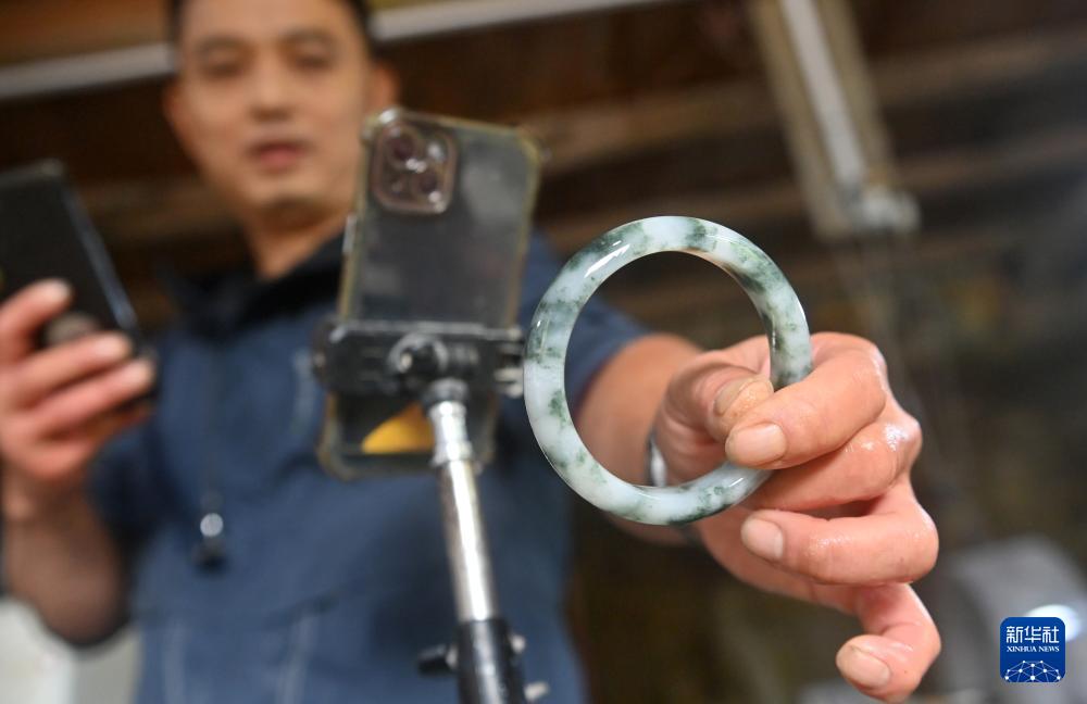 10月21日,在廣西龍勝各族自治縣三門鎮(zhèn)大地村,村民蘇緒華通過網(wǎng)絡(luò)直播推銷自己加工的玉器。