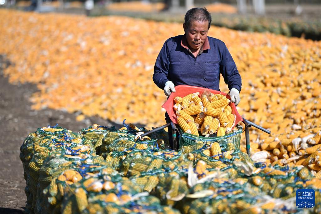 10月21日,天津市薊州區(qū)下窩頭鎮(zhèn)農(nóng)民在分裝玉米。
