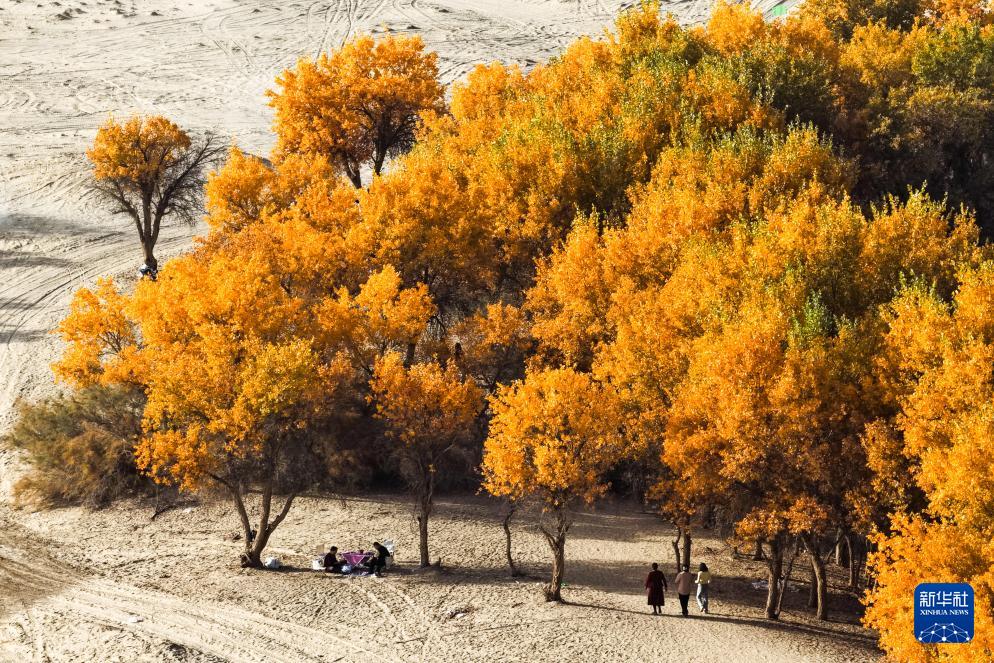 游客在新疆和田地區洛浦縣洛濱胡楊林景區游覽(無人機照片,10月19日攝)。