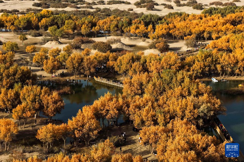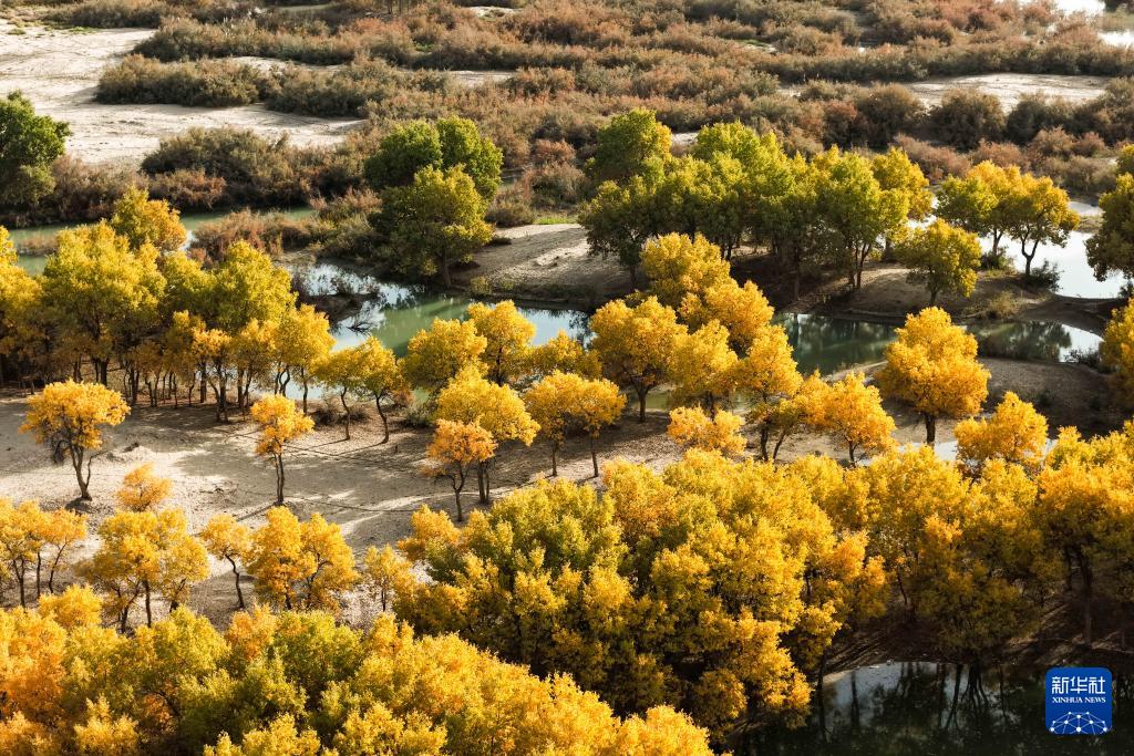 在新疆和田地區和田縣翡翠湖,成片胡楊林坐落其中(無人機照片,10月20日攝)。