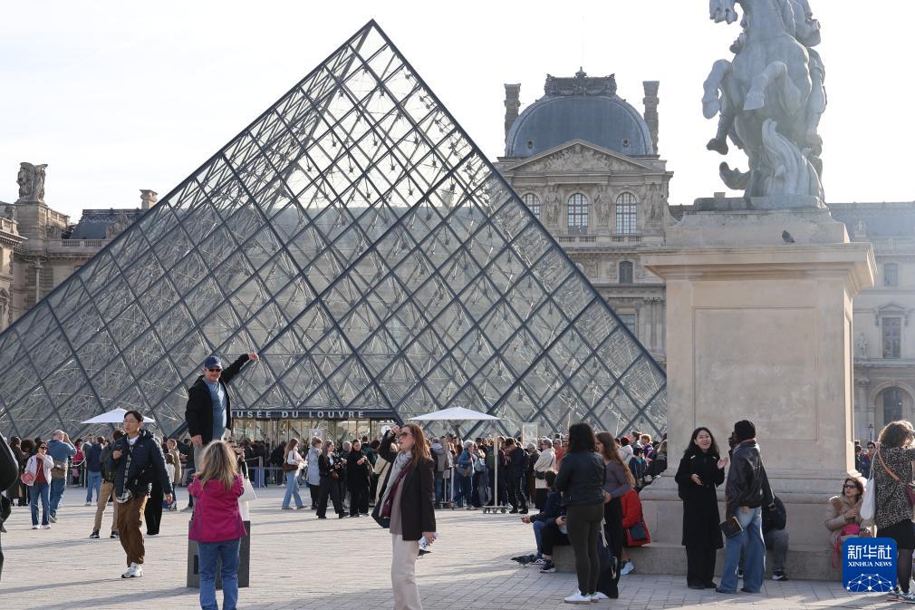 10月22日,在法國巴黎,大量游客聚集在盧浮宮博物館的玻璃金字塔入口前。