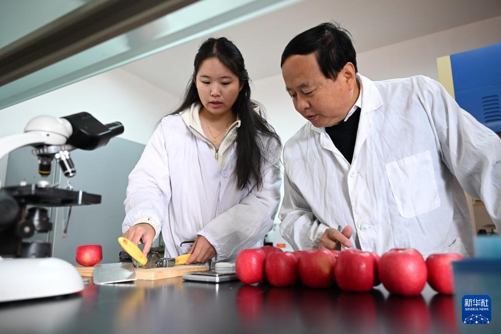 10月21日,西北農林科技大學白水蘋果試驗站站長高華(右)和碩士研究生于萌檢測蘋果糖度。