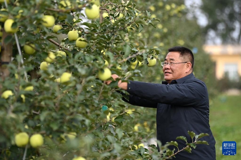 10月21日,西北農(nóng)林科技大學(xué)白水蘋(píng)果試驗(yàn)站首席專(zhuān)家趙政陽(yáng)教授查看試驗(yàn)站內(nèi)"瑞雪"蘋(píng)果的生長(zhǎng)情況。