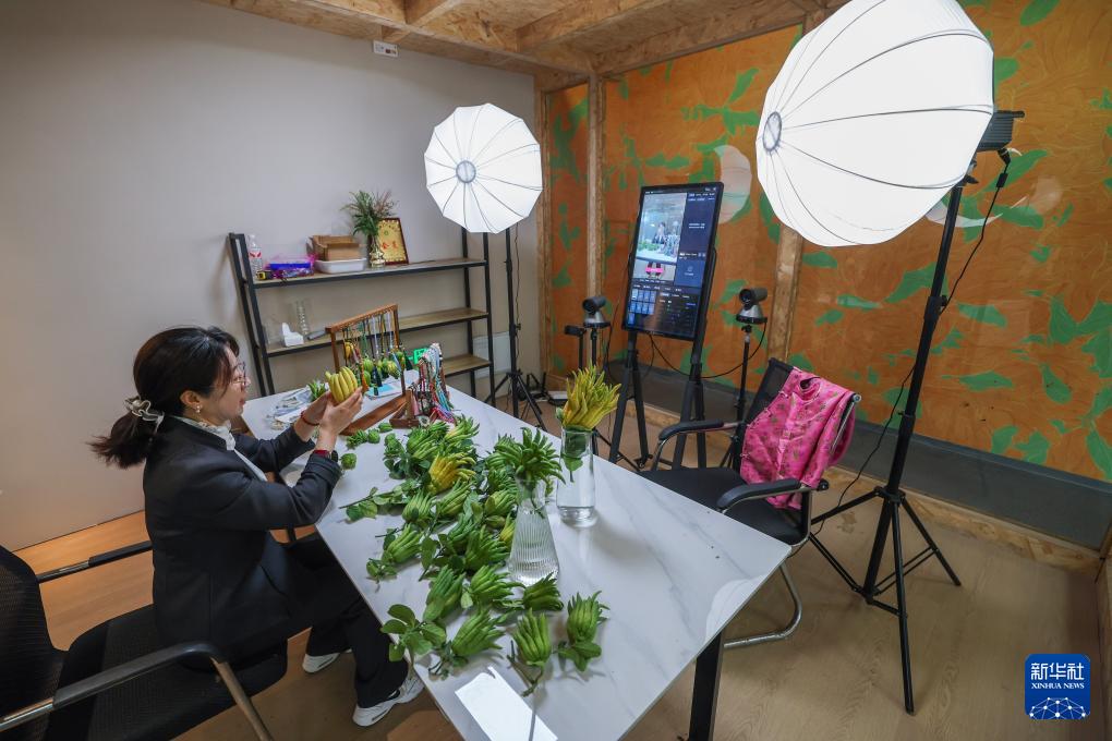 10月22日,在金華市金東區赤松鎮北山口村的金華佛手農林服務中心內的直播間,工作人員進行佛手鮮果及衍生產品的直播銷售。