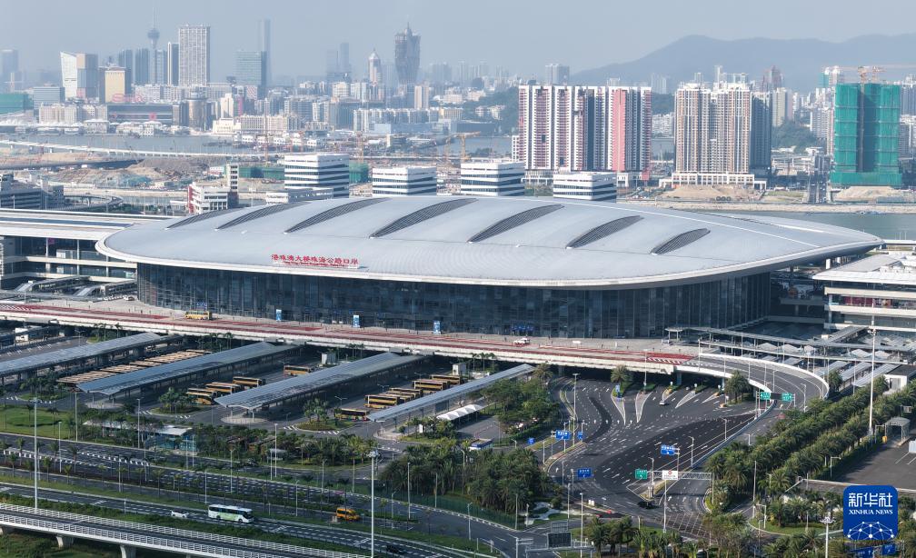 這是10月19日拍攝的港珠澳大橋珠海公路口岸,遠處是澳門市區(qū)(無人機照片)。新華社記者 鄧華 攝