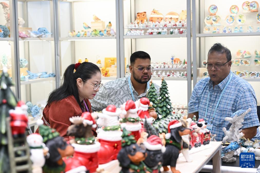 10月23日,境外采購商在禮品裝飾品展臺洽談。