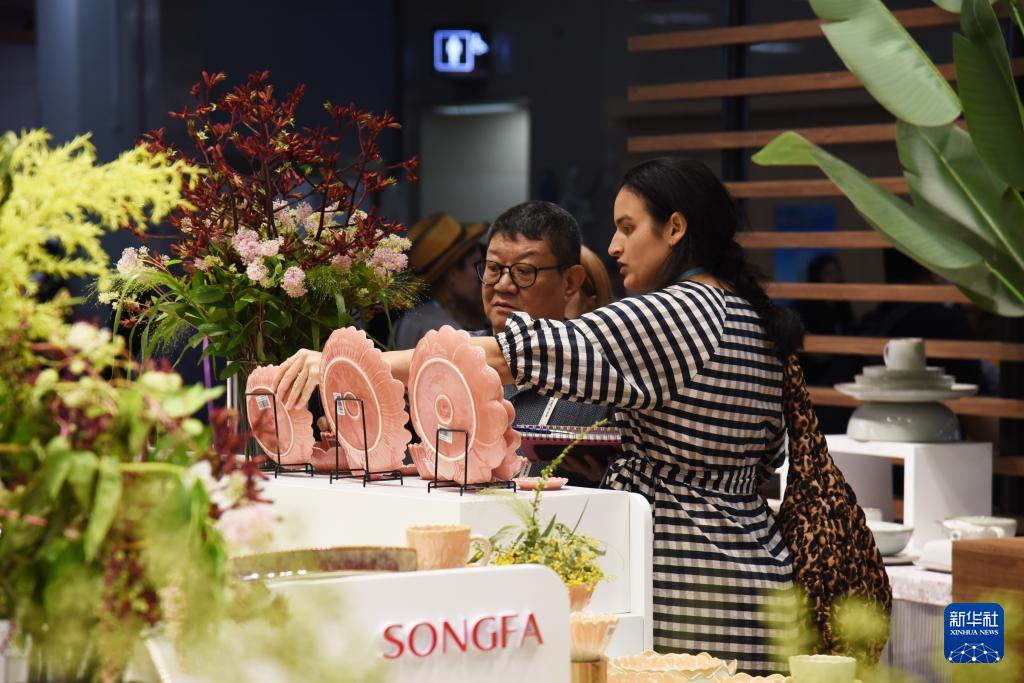 10月23日,境外采購商在日用瓷器企業(yè)展臺洽談。