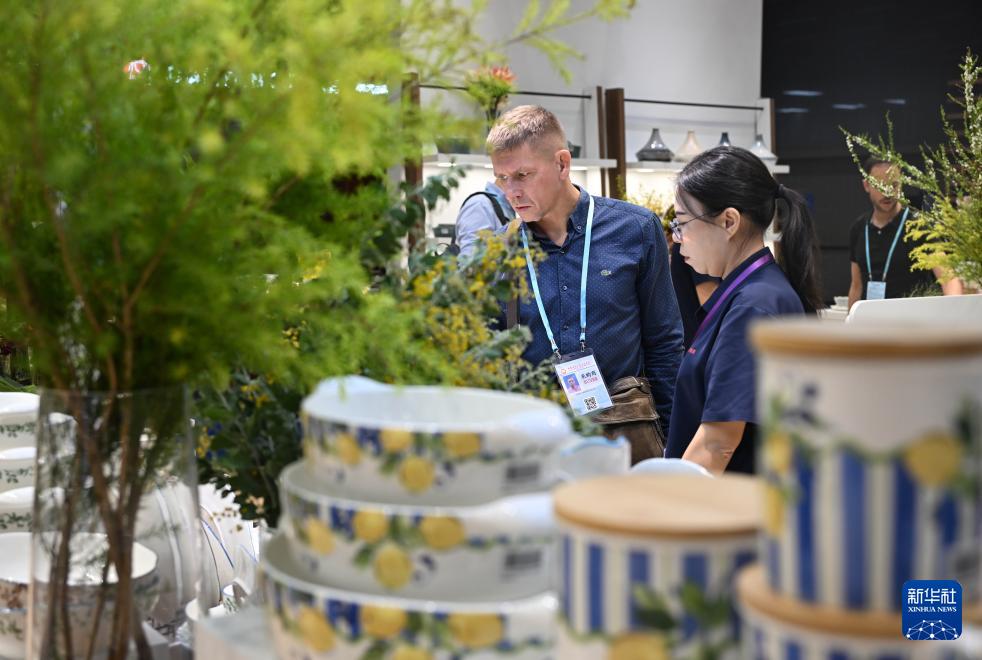 10月23日,境外采購商在日用瓷器企業(yè)展臺洽談。