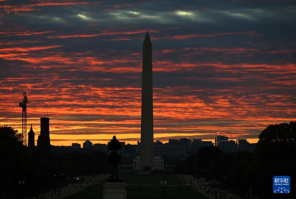 這是10月15日拍攝的日落時分的美國華盛頓紀念碑。新華社記者 李睿 攝