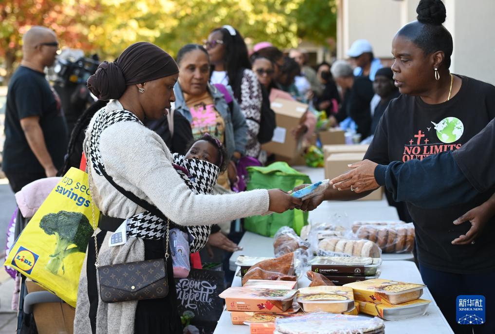 10月21日,在美國馬里蘭州海厄茨維爾市,聯(lián)邦雇員領取免費食品。新華社記者 李睿 攝
